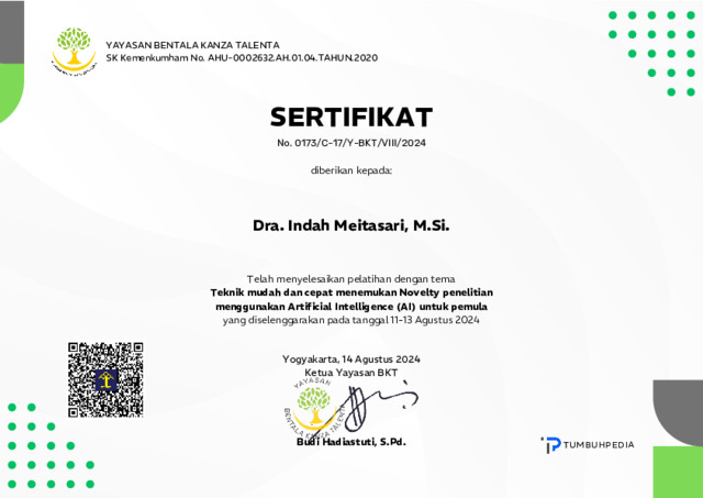 Sertifikat kegiatan mengikuti pelatihan "Teknik Mudah dan Cepat Menemukan Novelty Penelitian Menggunakan Artificial Intelligence (AI)"