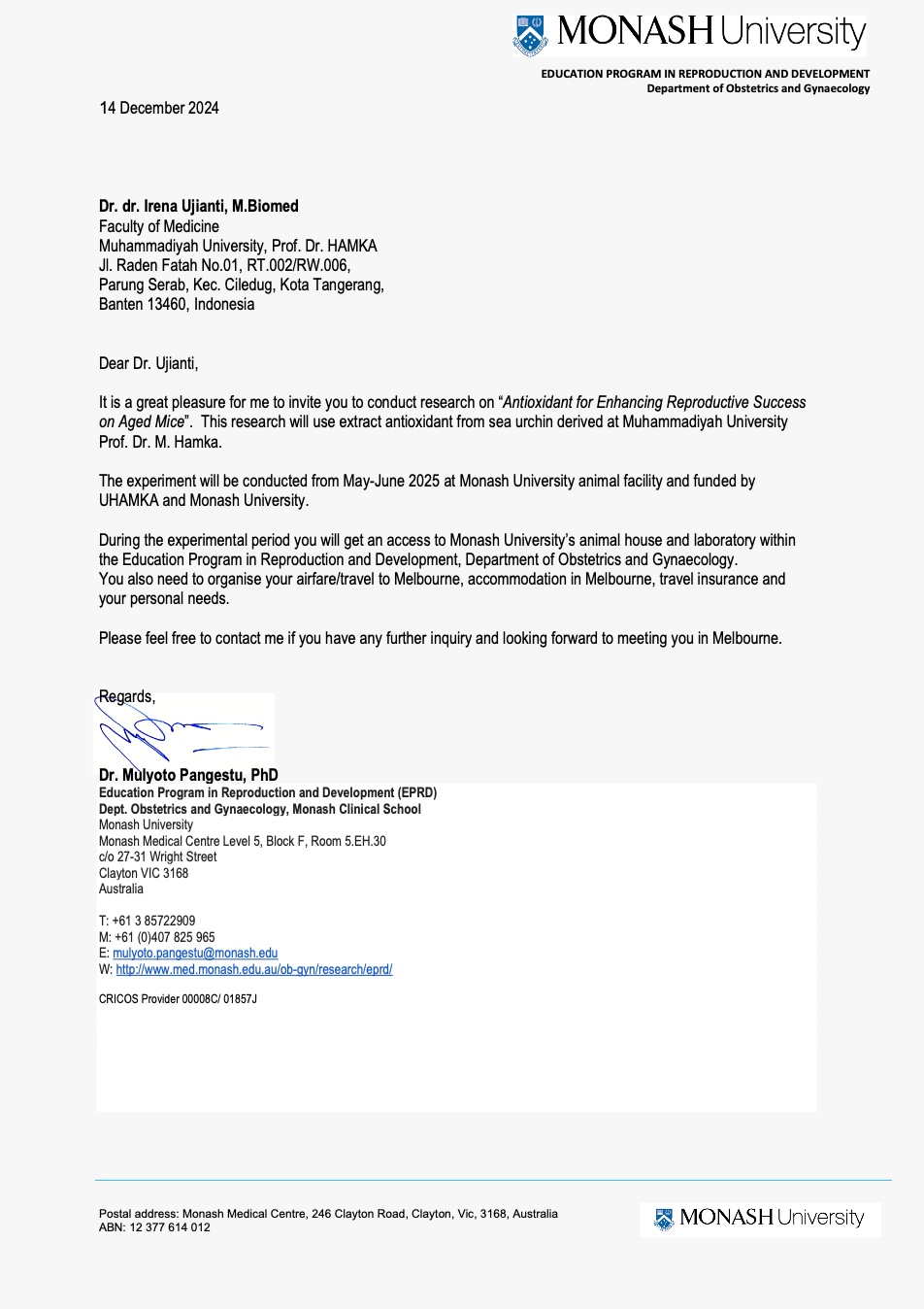 Ujianti, Irena Invitation letter. monash university.