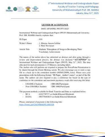 Heni Novita Sari, Heni Novita Sari STUDENTS’ PERCEPTIONS OF SONGS IN DEVELOPING THEIR VOCABULARY ACHIEVEMENT. 3rd International Webinar and Undergraduate Paper (IWUP) Committee, University of Muhammadiyah Prof. DR. HAMKA, 3 (1). pp. 54-64.