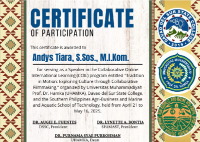 Tiara, Andys Certificate and Letter of Assignment - (21 April-16 Mei 2025) As Speaker in COIL Program Entitled Tradition in Motion; Exploring Culture through Collaborative Filmmaking. Universitas Muhammadiyah Prof. Dr. Hamka. (Unpublished)