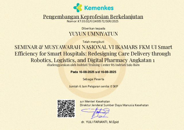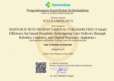 Yuyun Umniyatun, Yuyun SEMINAR & MUSYAWARAH NASIONAL VI IKAMARS FKM UI Smart Efficiency for Smart Hospitals: Redesigning Care Delivery through Robotics, Logistics, and Digital Pharmacy Angkatan 1. Kemenkes. (Unpublished)