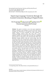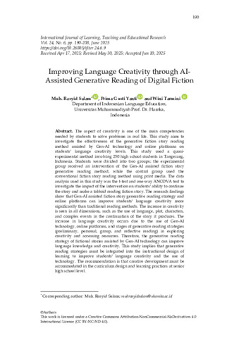Wini Tarmini, Wini (2025) Improving Language Creativity through AI- Assisted Generative Reading of Digital Fiction. IJLTER, 24 (6). pp. 190-208.