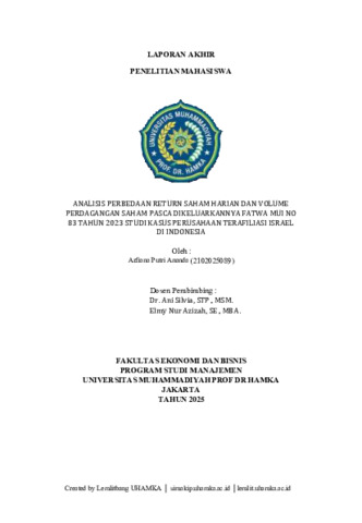 Azizah, Elmy Nur ANALISIS PERBEDAAN RETURN SAHAM HARIAN DAN VOLUME PERDAGANGAN SAHAM PASCA DIKELUARKANNYA FATWA MUI NO 83 TAHUN 2023 STUDI KASUS PERUSAHAAN TERAFILIASI ISRAEL DI INDONESIA. Goodwood Conference. (Submitted)