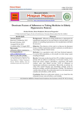 Mardhiati A, S.KM., M.Kes, Dr. dan Mardhiati A, S.KM., M.Kes, Dr. dan Mardhiati A, S.KM., M.Kes, Dr. dan Mardhiati A, S.KM., M.Kes, Dr. (2023) Dominant Factors of Adherence to Taking Medicine in Elderly Hypertensive Patients. Magna Medika, 10 (2). pp. 199-210. ISSN 27742318