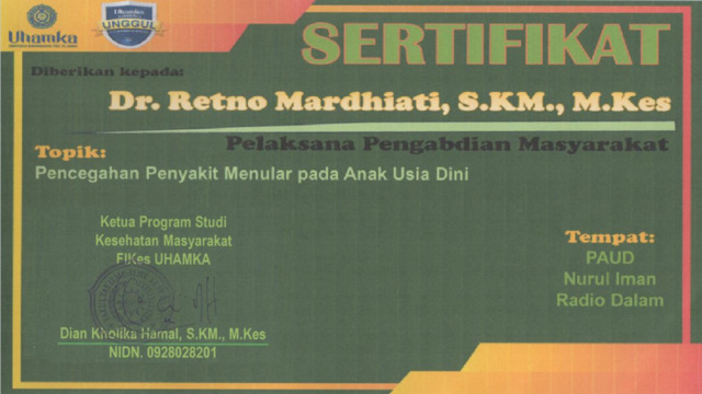 Mardhiati A, S.KM., M.Kes, Dr. dan Mardhiati A, S.KM., M.Kes, Dr. dan Mardhiati A, S.KM., M.Kes, Dr. dan Mardhiati A, S.KM., M.Kes, Dr. Sertifikat Pengabdian Masyarakat di PAUD Nurul Iman Kebayoran Baru. Universitas Muhammadiyah Prof. Dr. Hamka. (Unpublished)