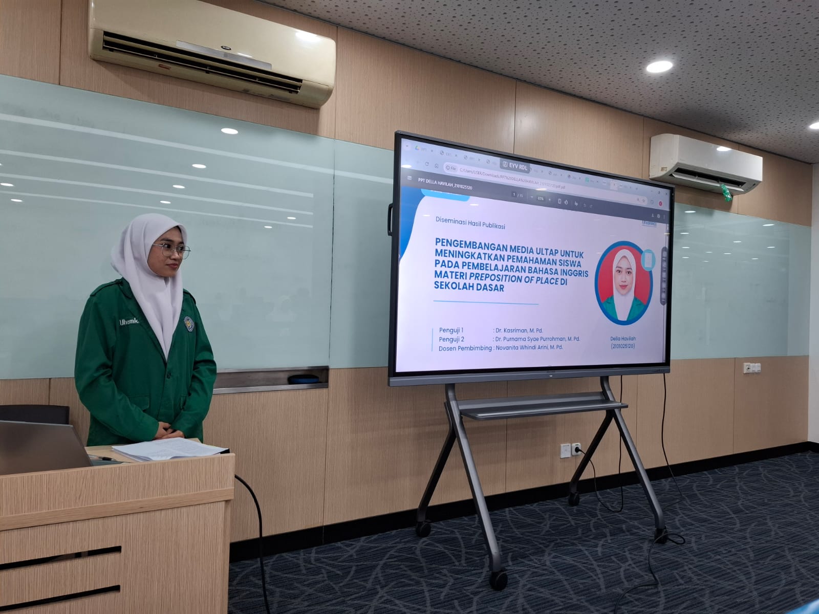 Foto presentasi/oral dari Presenter untuk hasil publikasi dari penelitian Pengembangan Media ULTAP untuk Meningkatkan Pemahaman Siswa pada Pembelajaran Bahasa Inggris Materi Preposition of Place di S